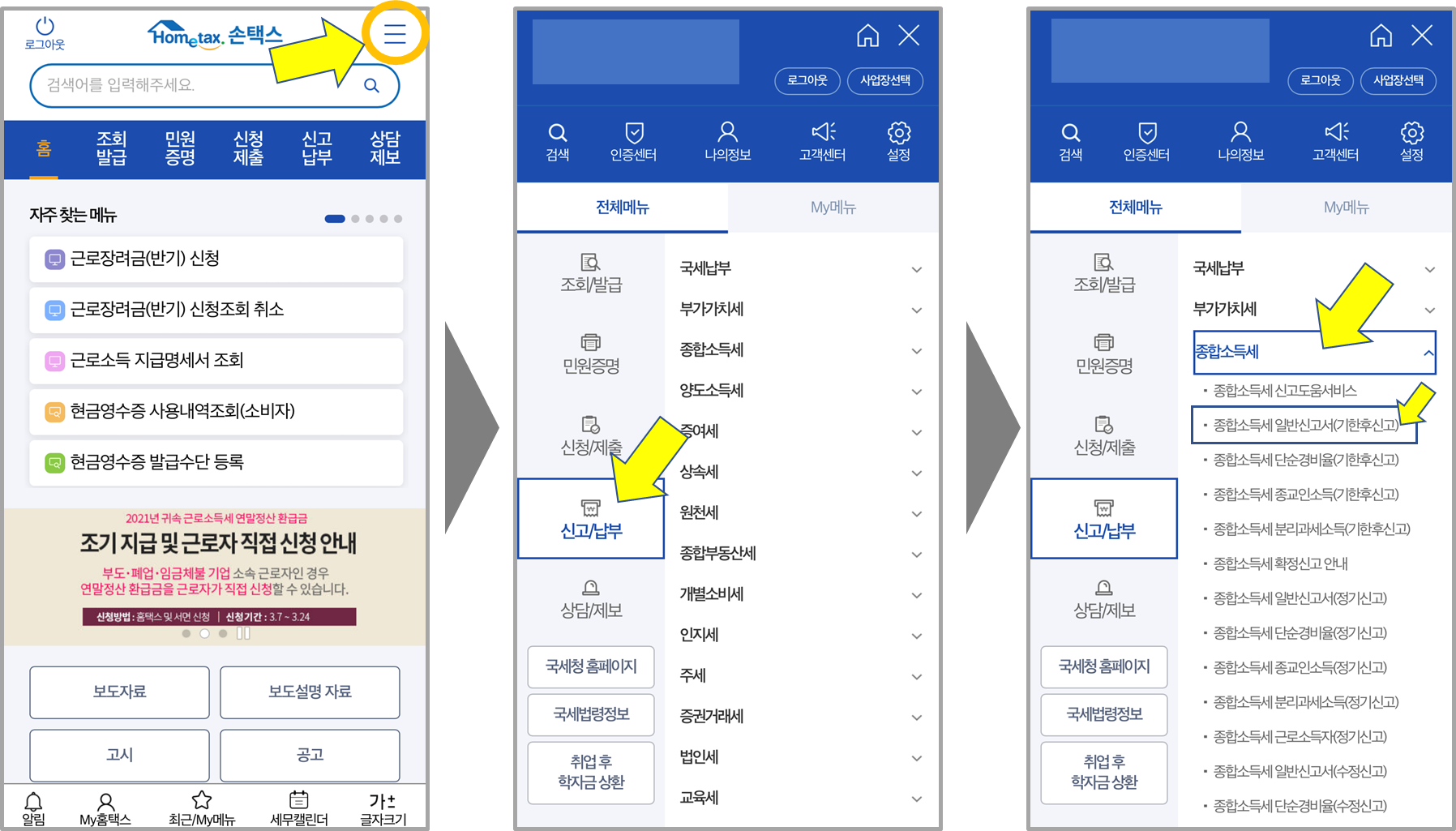 1. 핸드폰 홈택스 어플 또는 홈택스 홈페이지에서 신고/납부 탭에서 종합소득세 일반신고서(기한 후 신고)를 선택합니다. (로그인 필수)