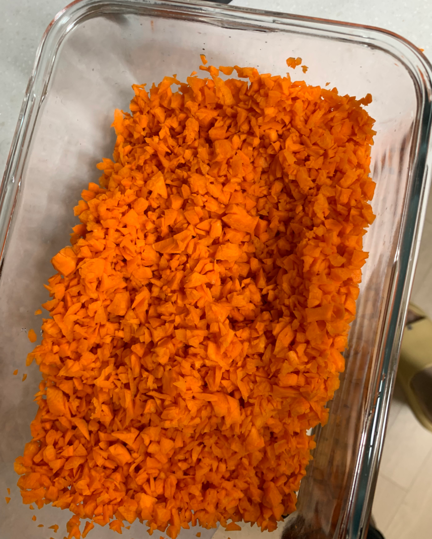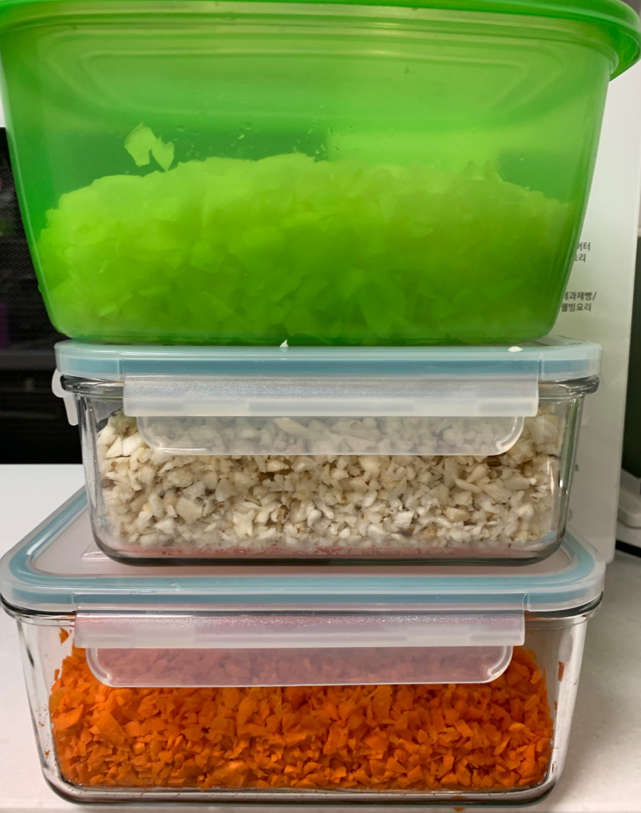 결과물은 꽤 괜찮습니다. 아주 잘 갈리고 제가 원하는 만큼 잘라줍니다. 하지만 너무 오래 사용하면 너무 잘게 잘리게 되므로 적당한 정도만 사용하는 것이 좋습니다. 또한 여기서 주의해야할 것은 당근입니다. 당근은 플라스틱 용기에 저장하는 것을 피하시길 바랍니다. 용기가 당근 색으로 물이 들더라구요. 그래서 유리 용기에 넣어두었습니다.