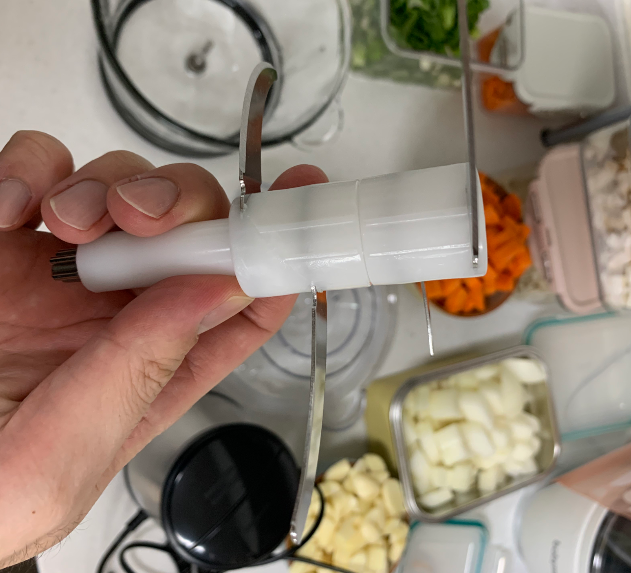 작동을 위해 칼날 설치시 칼이 십자 모양으로 위치해야 합니다. 중간 플라스틱 부분에 고정 마크가 있는데 일치되면 제대로 세팅된 것으로 보시면 됩니다.