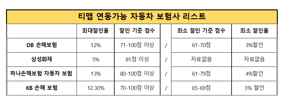 그러면 아래와 같이 티맵과 연동 가능한 자동차 보험사 리스트가 확인이 됩니다. 하나손해보험이 13%로 가장 높고 제가 하고 있는 DB손해보험이 12% 입니다. 대부분 안전운전 점수가 61점 이상이면 할인을 받을 수 있습니다. 안전운전 점수를 유지할 수 있는 팁은 아래에 자세히 적어 두겠습니다.