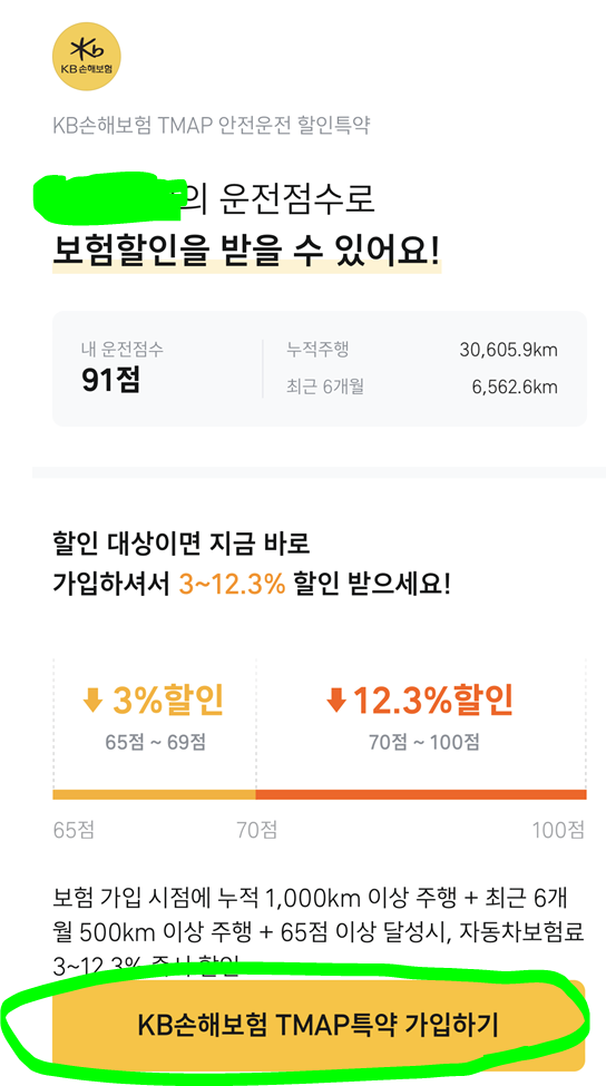 저는 DB 손해보험 에 가입되어 있는데 DB 손해보험의 경우 TMAP 특약으로 61점 이상, 누적 1,000KM, 최근 6개월 500KM 이상일 때 12% 할인을 받을 수 있습니다.