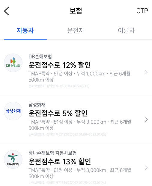 자신의 보험과 티맵 안전운전 점수를 연동하는 것입니다. 하지만 티맵 안전운전 점수와 연동될 수 있는 보험이 몇 가지로 한정되어 있다는 점에 유의하시기 바랍니다.