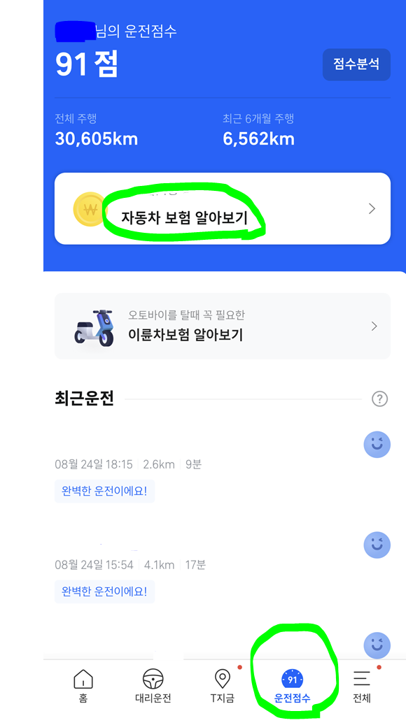 확인은 티맵 실행 후 하단에 운전점수 탭 -> 자동차 보험 알아보기를 선택합니다.