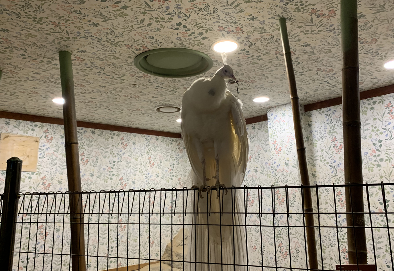 공작새도 있었는데 울타리 위에 앉아 있었습니다. 깜짝 놀랐는데 자주 저렇게 올라오거나 울타리를 넘어와서 돌아다닌다고 합니다.