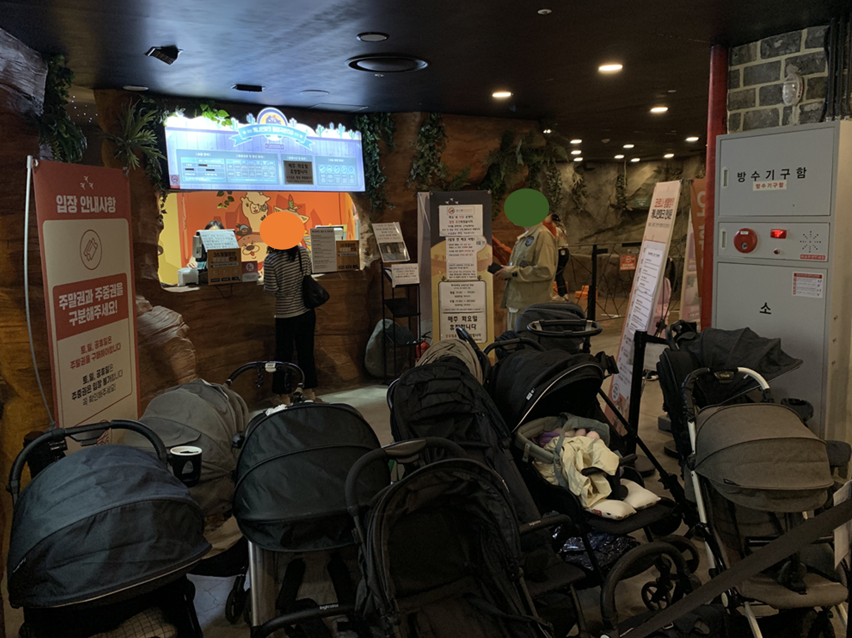 부산 캐니언 파크는 유모차 출입이 불가 합니다. 그래서 유모차 보관소에 이렇게 비치를 하고 들어가야 합니다. 그래서 위에서 말씀드렸다시피 아기띠를 하시는 것을 추천 드립니다. 어른의 눈높이에서 볼 때 동물들을 잘 볼 수 있는 부분이 있어서 그렇습니다. 또는 아기에게 신발을 신겨 다니는 것도 좋을 것 같습니다.
