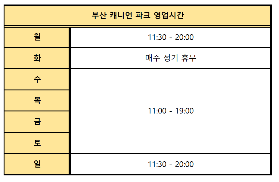 부산 캐니언 파크의 영업시간은 매주 화요일이 정기 휴무 입니다. 나머지는 주로 11시~19시, 20시까지 운영 됩니다.