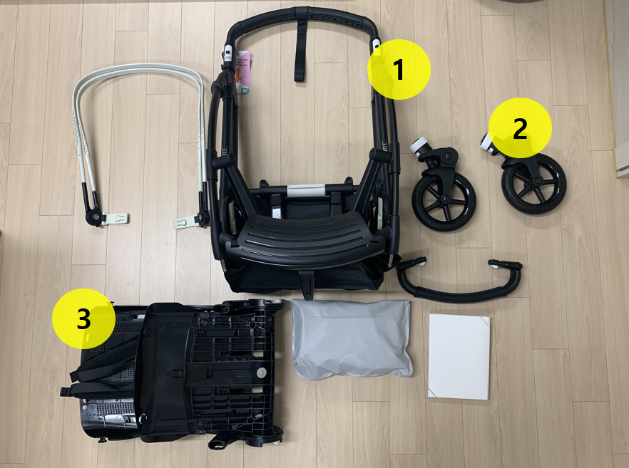 조립방법은 꽤 간단합니다. 1번이 부가부 비6의 바디 프레임입니다. 저것을 펼치기 전에 2번 바퀴들을 하단에 끼워 줍니다. (설명서 참조). 그리고 3번 시트를 프레임에 안착시켜주면 됩니다.