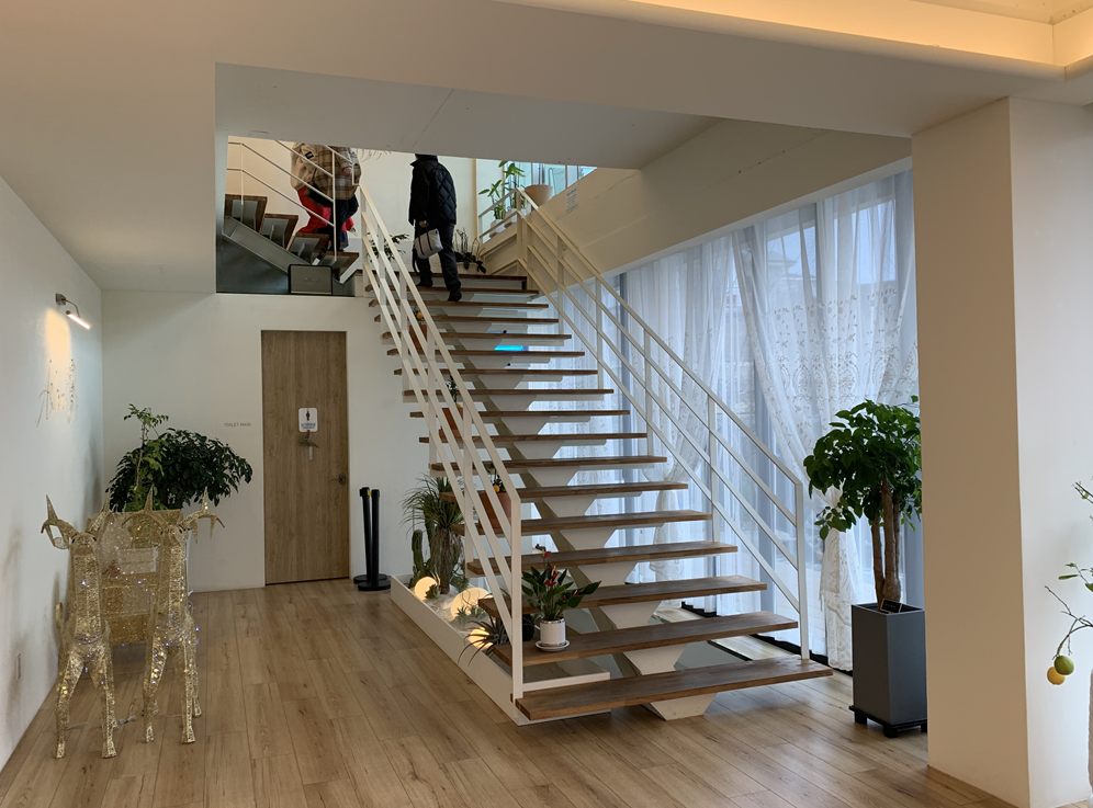 이층으로 올라가는 계단입니다. 올라가는 계단 아래에 남자 화장실이 배치되어 있습니다. 공간 구조 배치를 잘 한 것 같습니다. 계단은 가운데 지지대가 있는 형태인데 올라갈 때 약간의 흔들림이 있어 조금 불안한 느낌이 들었지만 튼튼했습니다.